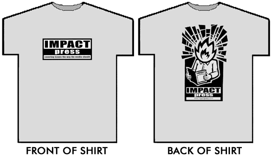 ![]() This fantastic shirt is made of 100% recycled material (50% cotton, 50% polyester) of the utmost quality and are made in the USA. They are available in ash (gray) with black ink in XL, L, M, and S. Try and list alternate sizes (in case we are out of stock of what you want). How much could such a great shirt cost? $25, $50, $100? No way! Because we love our readers, each shirt is available to you for only $14ppd U.S. ($18/Canada and $22/elsewhere). To order a shirt, send a check or money order to: IMPACT press, PMB 361, 10151 University Blvd., Orlando, FL 32817.
